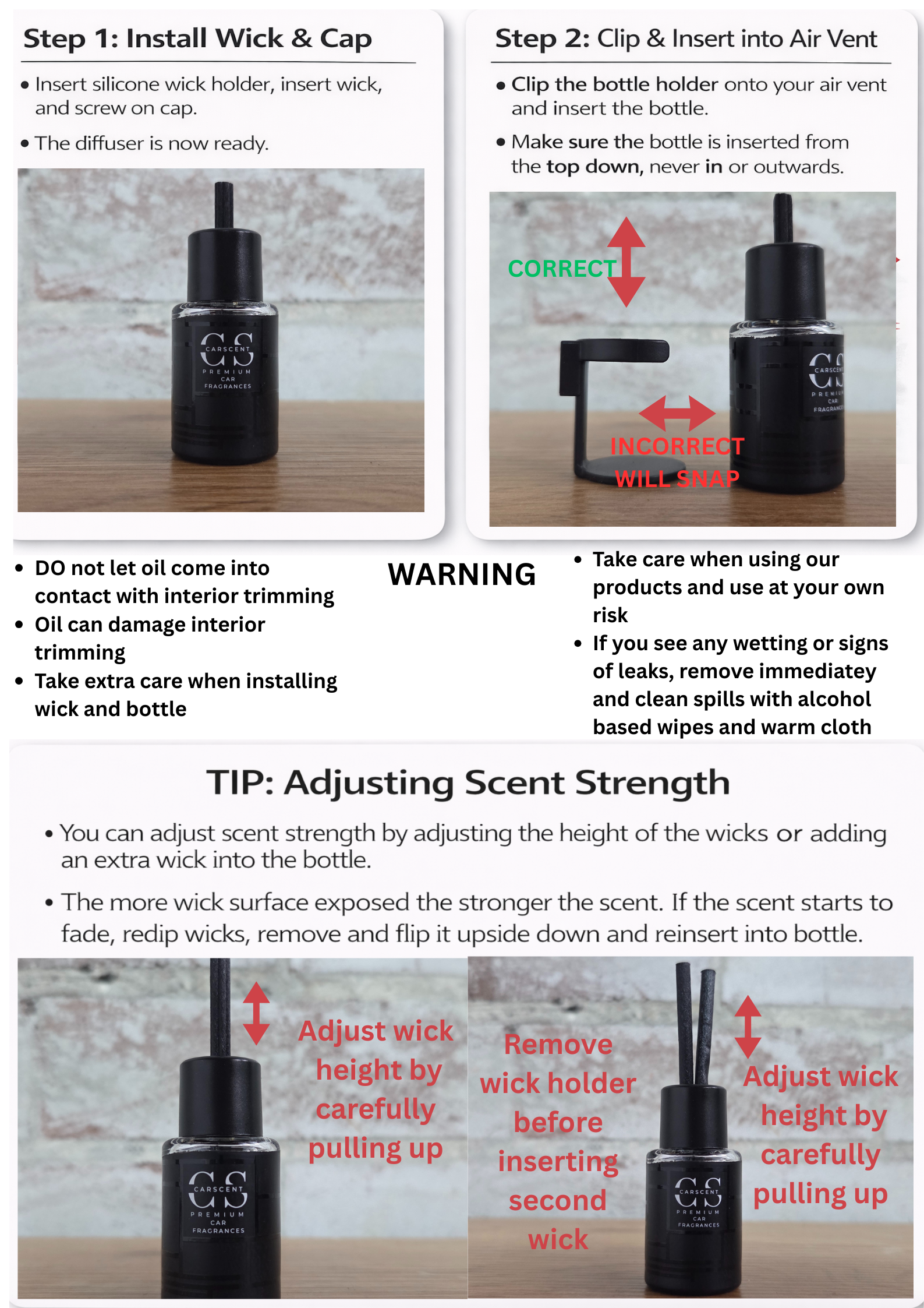 IMPORTANT NOTE: The more soaked the wooden cap and string is, the STRONGER the scent